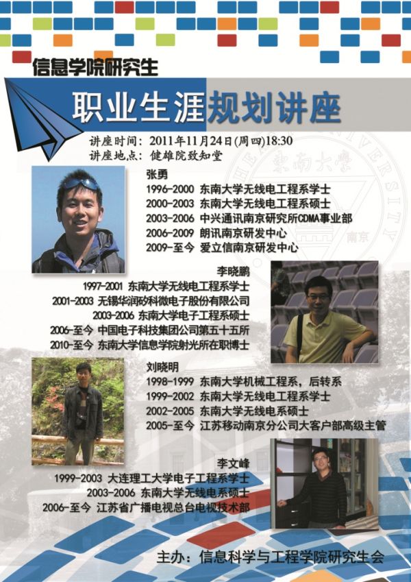 他山之石可以攻玉,前辈的经验不仅能让我们了解最新的行业人才需求,更能帮助你我对未来的职业道路有一个全面的认识与把握。现特邀请目前在不同领域发展的优秀学长为我们指点迷津、分享成长经验,更有现场互动交流的机会,欢迎大家参加!