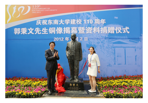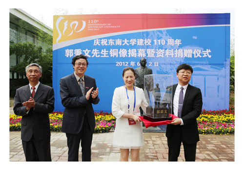 左惟常务副书记在仪式上致辞,回顾了郭秉文先生的主要经历以及对东南大学的杰出贡献,并与郭秉文先生家属徐芝韵女士共同为铜像揭幕。徐芝韵女士在讲话中介绍了郭秉文先生为他的教育理想而努力、奋斗终生的无私情怀,并代表郭先生家属向学校及社会各界的支持和关注表达了诚挚的感激之情。此次铜像的捐赠者、我校无线电系87级校友、光一科技有限责任公司董事长龙昌明先生向徐芝韵女士赠送了铜像小样。此外,徐芝韵女士还向我校档案馆捐赠郭秉文先生生平资料,左惟常务副书记向徐女士回赠礼品和捐赠证书。(张琰佳)