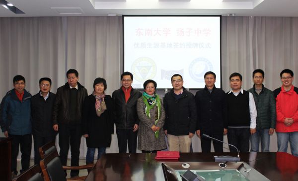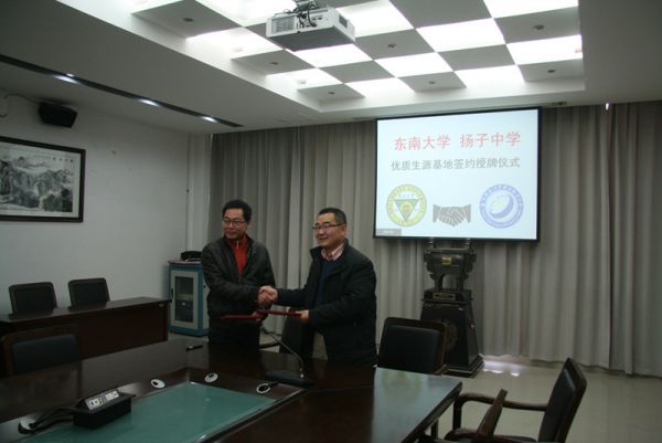 蔡亮副处长详细介绍了我校的历史沿革、整体实力、优势学科以及近年来在改革发展中取得的成绩。他在讲话中肯定了扬子中学优质的教学力量,对多年来向东大输送大量优秀学生表示感谢,并诚挚表达了希望进一步加强联系、沟通合作、吸纳更多优秀生源的良好愿望。他代表学校与吴卫东校长签订协议书,并向扬子中学授予“东南大学优质生源基地”铜牌。