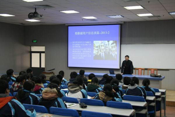 随后,我校胡爱群教授在扬子中学至精楼多媒体教室面向扬子中学高中重点班100余位同学做了主题为“信息安全技术概论”的学术讲座,介绍了如今信息安全技术的一些概况,并对他们提出的问题一一做了解答。