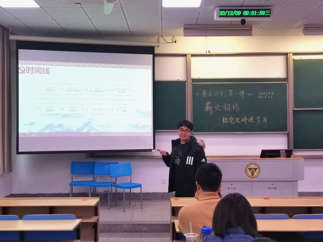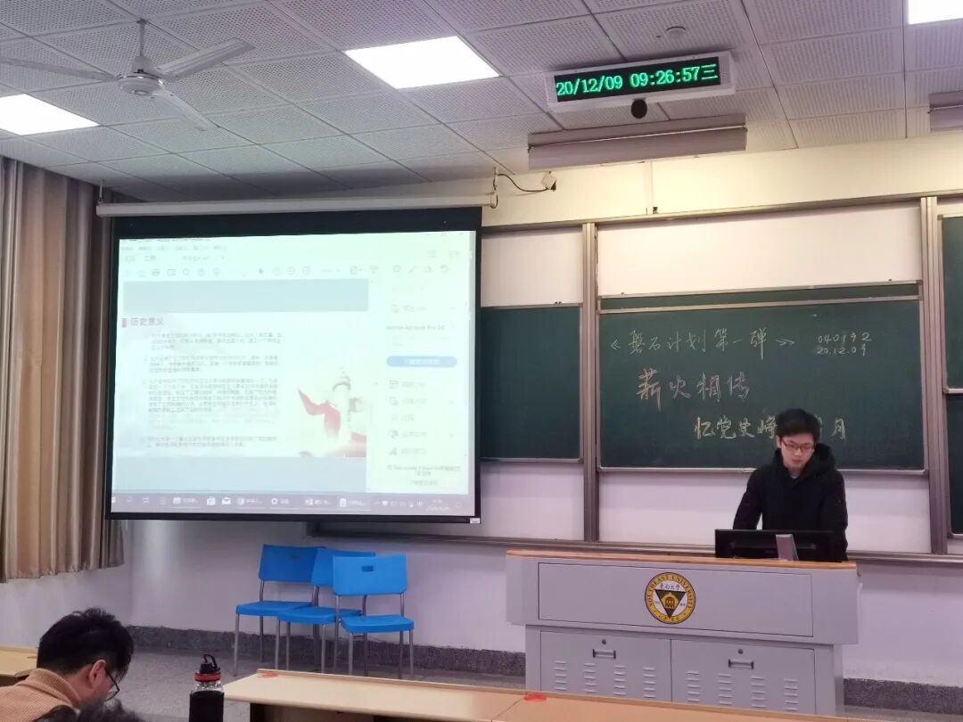 2020年12月9日,一二·九抗日救亡运动八十五周年之际,040192班召开了第三次班会暨磐石计划第一次会议:薪火相传——忆党史峥嵘岁月。在会议上,同学们交流分享了中国共产党自成立之日起到今天,一百年来的奋斗历程与重大事件。