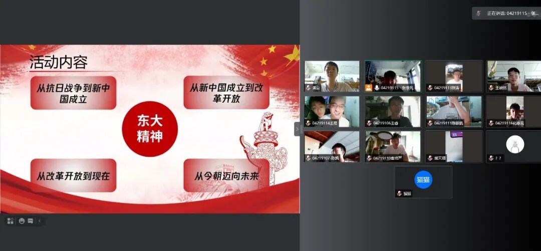 本次支部分为四个团小组,每个团小组围绕一个时间段进行深入学习,并在支部大会上进行分享。我们将四史按照时代内涵划分为中国共产党成立到新中国建立、新中国建立到改革开发、改革开放到当下和未来四个阶段,从中提炼东南大学在四个阶段的发展背后呈现的“东大精神”,有小到大,更好地去理解中国共产党在实现中华民族伟大复兴的一百年光辉岁月中崇高的社会理想和高尚的政治要求。