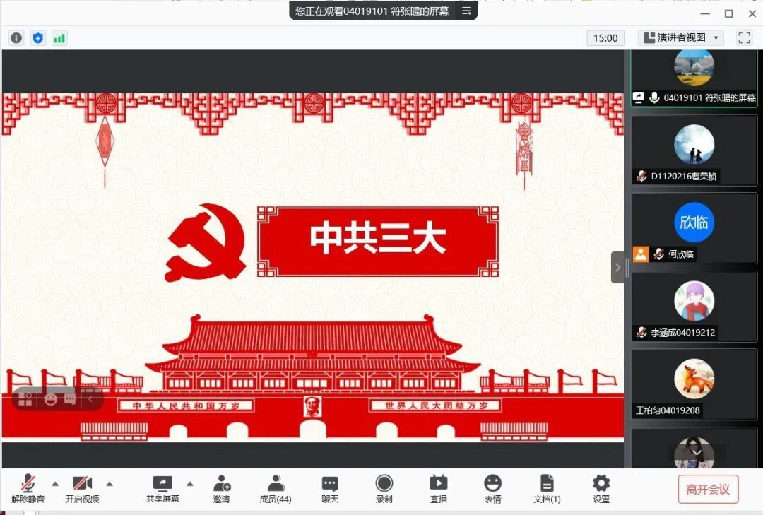 为庆祝建党一百周年,由D11202、D11205、D21201、040191、040192、040194六个团支部联合举办的党代会云回忆活动历时两周才落下帷幕,通过线上分享的方式,各支部同学们呢重温了从中共一大到中共十九的历史,体悟了中国共产党一路走来的艰辛不易,许许多多同学在活动后写下自己的感悟并互相分享,提高了自己爱党爱国的热情,也让同学们更加认识到中国共产党的伟大铿锵。