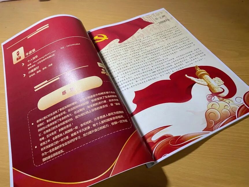 在团支书的带领下,支部成员共同完成了团员手册的制作,大家或是谈了谈自己对党史的认识,或是分享交流了抗疫的心得,还有同学在手册中写下了对自己或对我们这一代中国青年未来的展望。